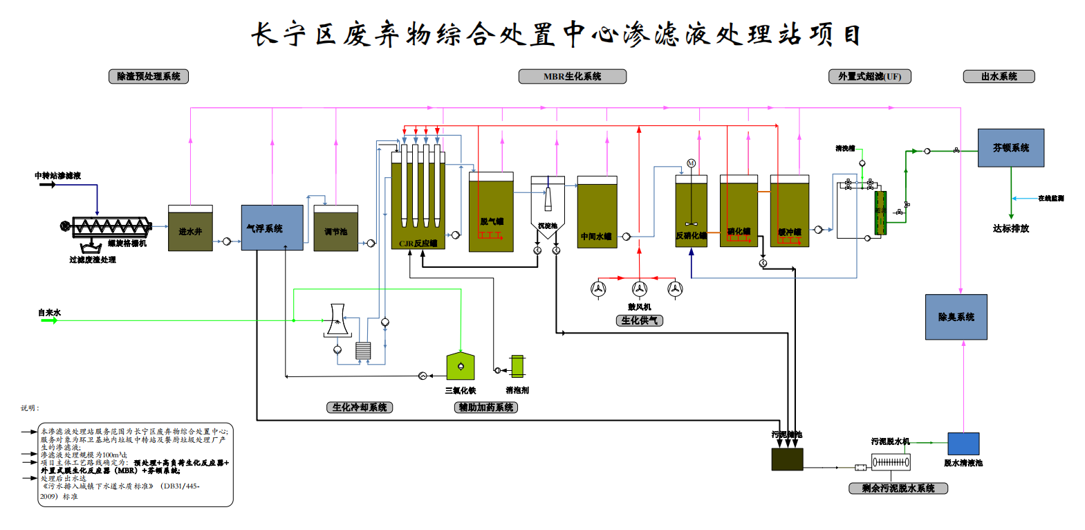 由于滲濾液污染物濃度高,現場用地狹小、形狀極不規則,項目選用了高效CJMBR工藝(以CJR為核心的好氧生化技術)作為主體工藝,CJMBR處理效率高、運行穩定,本項目是CJMBR工藝首次運用在中轉站滲濾液處理領域。