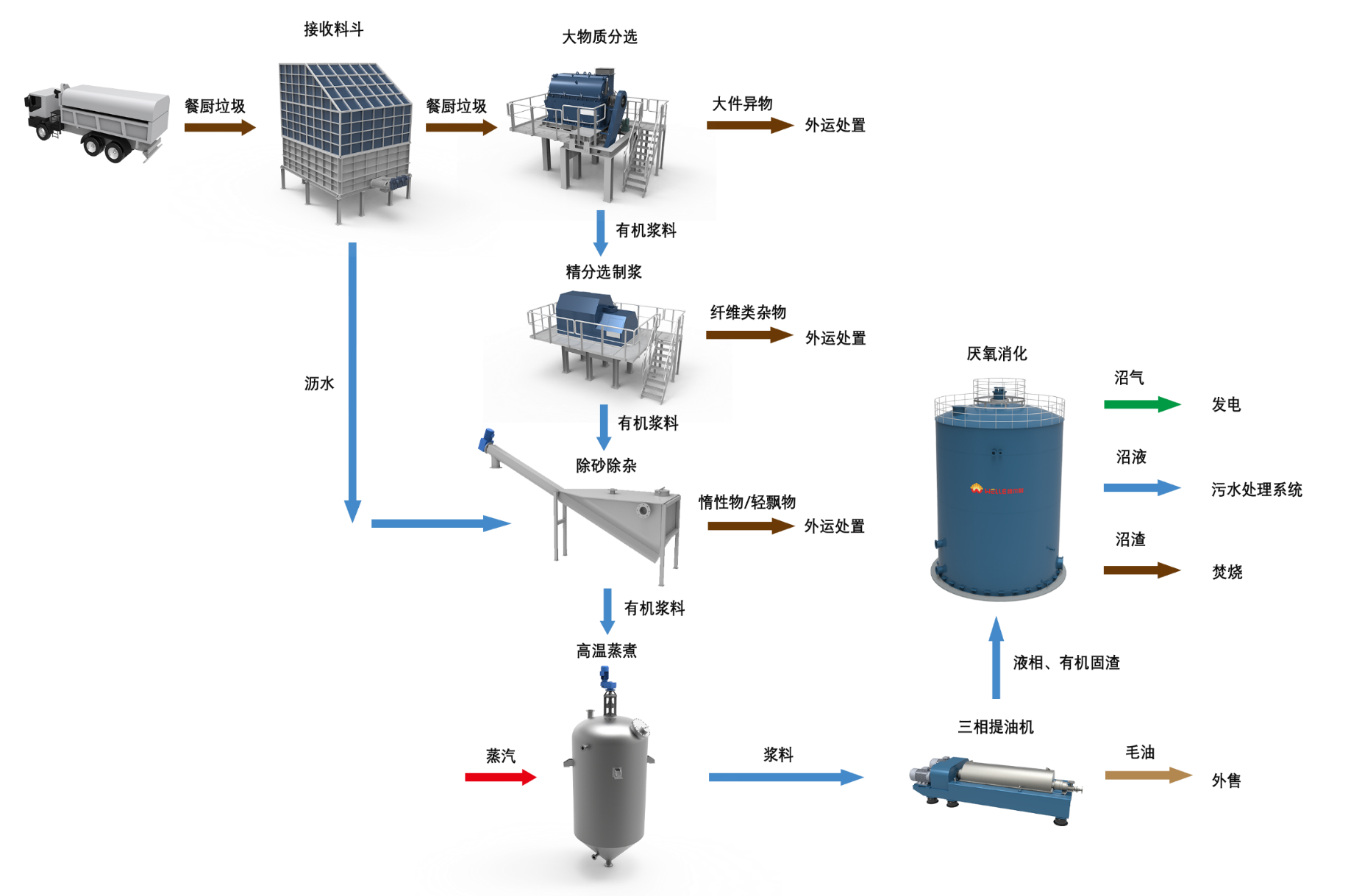 結(jié)合一期項(xiàng)目的運(yùn)營(yíng)經(jīng)驗(yàn),充分考慮到餐廚垃圾的特點(diǎn)和處理難點(diǎn),二期項(xiàng)目采用“機(jī)械預(yù)處理+厭氧發(fā)酵+沼氣發(fā)電+污水處理+除臭處理”終端處置工藝,該工藝在減少處置過程中固渣、廢水、臭氣等污染物的同時(shí),充分有效地分離餐廚垃圾中的有機(jī)質(zhì)并對(duì)其進(jìn)行資源化利用,實(shí)現(xiàn)了餐廚垃圾中油脂的最大化資源回收。